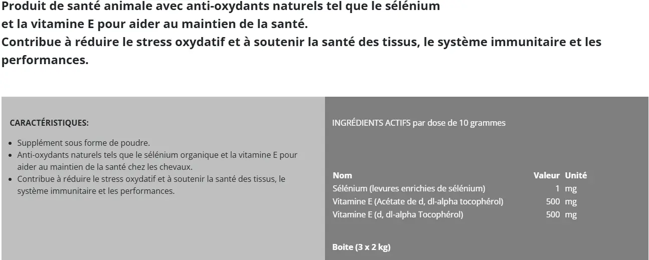 La recommandation est de 20 g par jour pour un cheval adulte de 500 kg. Administrer oralement pendant le repas.