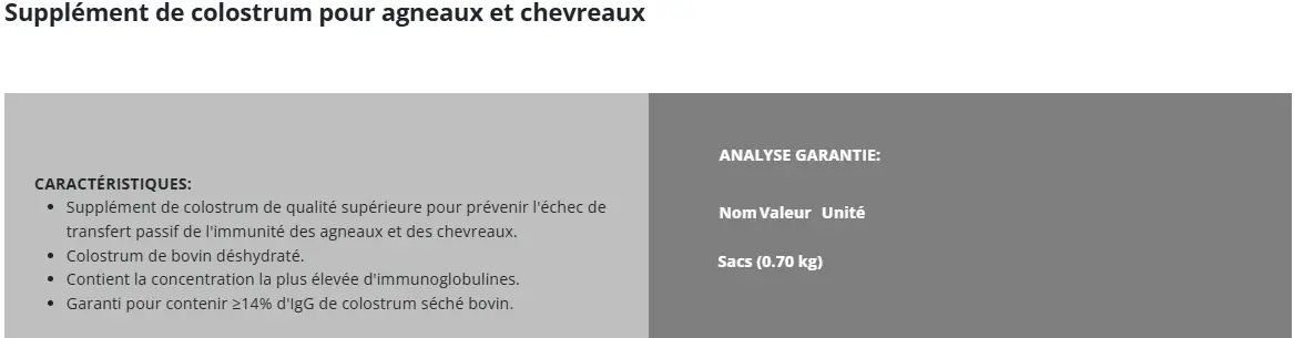 - Complète ou remplace le colostrum de la brebis ou de la chèvre lorsque la qualité ou la quantité est insuffisante.