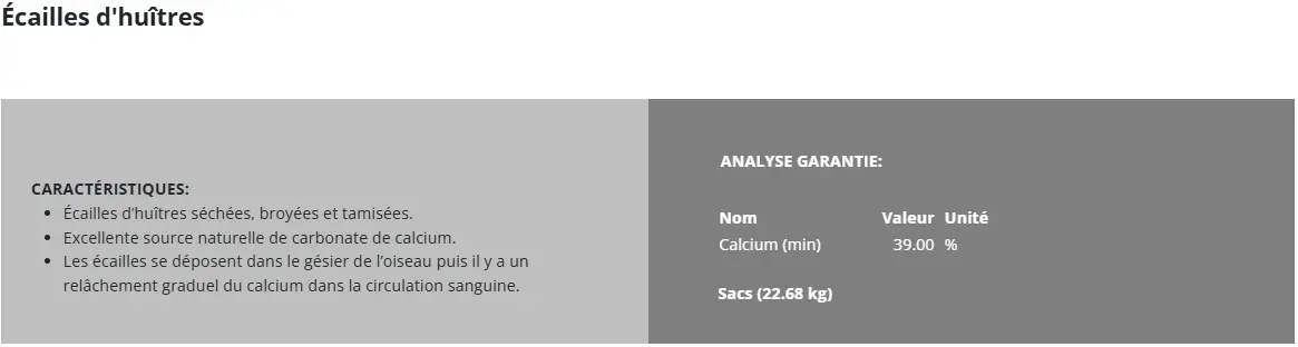 À ajouter à la ration lorsque la teneur en calcium de la moulée est insuffisante ou chez les poules vieillissantes ou qui présentent une moins bonne absorption du calcium.