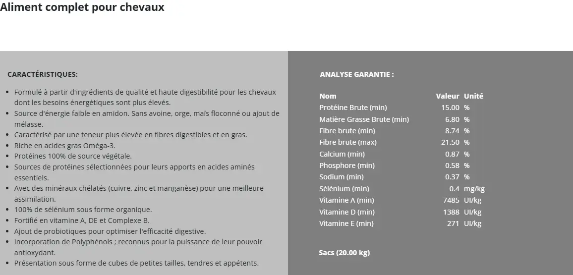- Cheval souffrant de troubles métaboliques (Tying-up, Cushing, résistants à l'insuline, sensibles à la fourbure) nécessitant une diète faible en sucres et amidon (HCNS).