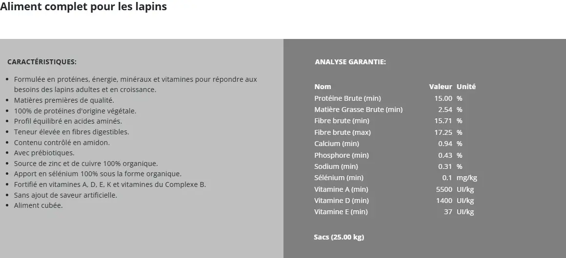 Luzerne déshydratée, pulpe de betteraves, soya Bélisle, blé, gros gluten, maïs, tourteau de canola, micro lapin 10K, phosphore, huile végétale, mélasse, sel, calcium, prébiotiques, acides aminés et liants