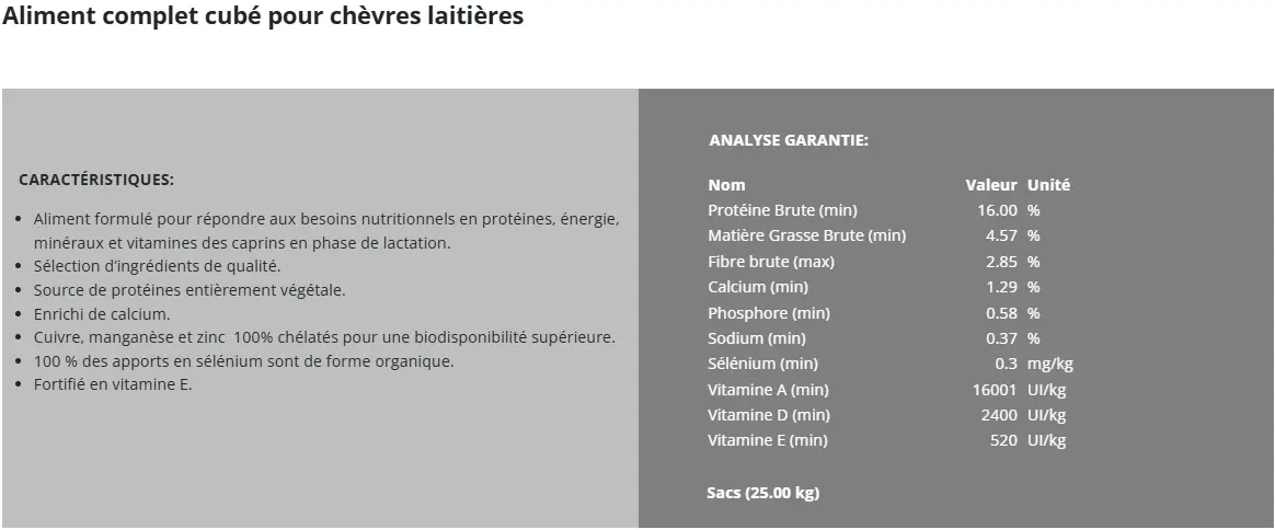 Maïs, tourteau de soya, drèche de maïs, Caprin 16-6 (prémélange de minéraux et vitamines pour chèvre), calcium, huile végétale, mélasse liquide et liant.