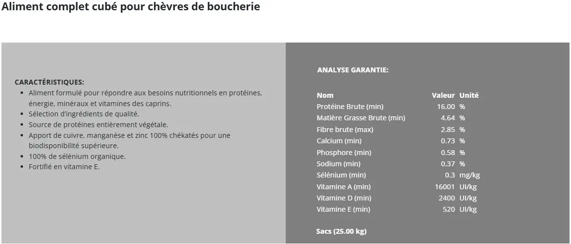 - Optimise la production laitière en complément de fourrages de qualité chez la chèvre de boucherie.