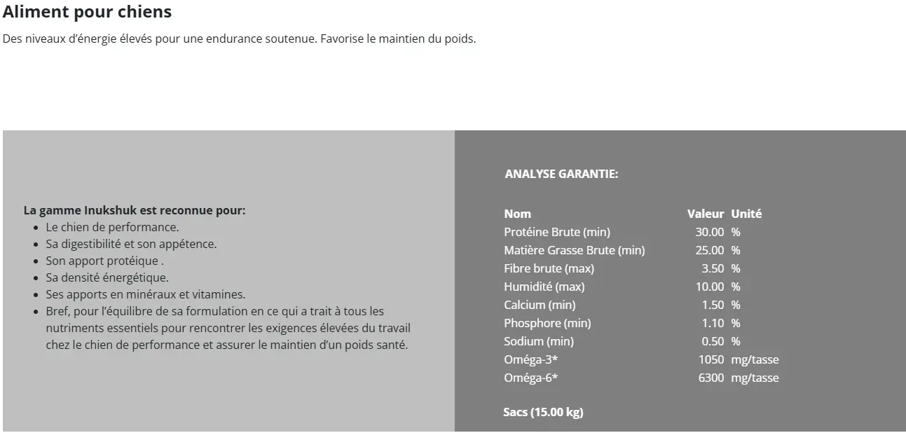 *Non reconnu comme un nutriment essentiel par les profils nutritionnels des aliments pour chiens de l'AAFCO. Toutes les formules Inukshuk sont conformes aux normes de l'AAFCO.
