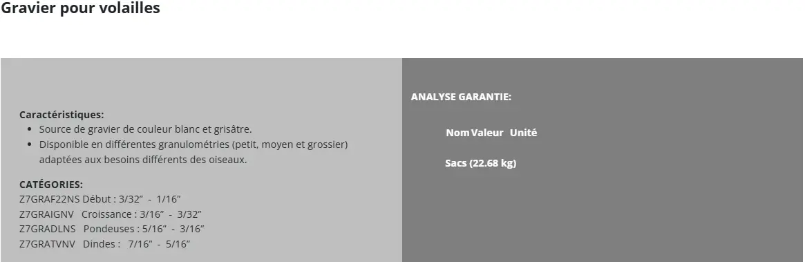 Utiliser la taille de gravier appropriée au stade de croissance et la taille de l'oiseau