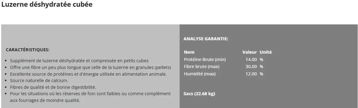 La luzerne cubée peut remplacer jusqu’à 50 % de la ration de foin habituelle. C'est un excellent substitut dans les situations où le foin est trop dispendieux, rare ou de mauvaise qualité.