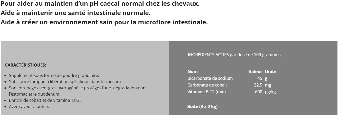 Pendant la période du printemps ou de l'automne lorsque les niveaux de sucres dans l'herbe du pâturage sont variables, ajouter 100 grammes supplémentaires.